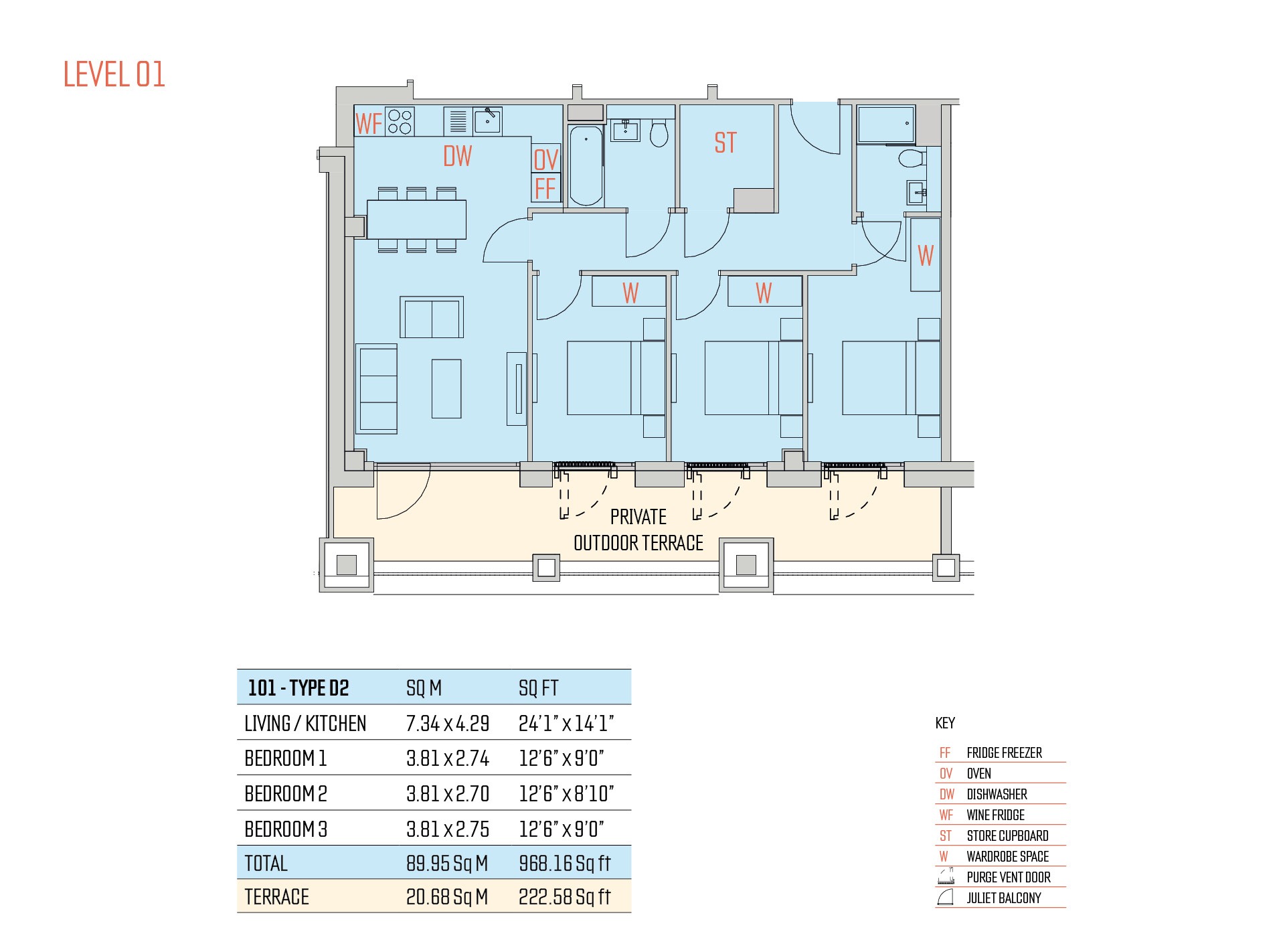 *300mm wine cooler (all 1 bedroom apartments), 600mm wine cooler (2 & 3 bedroom apartments).