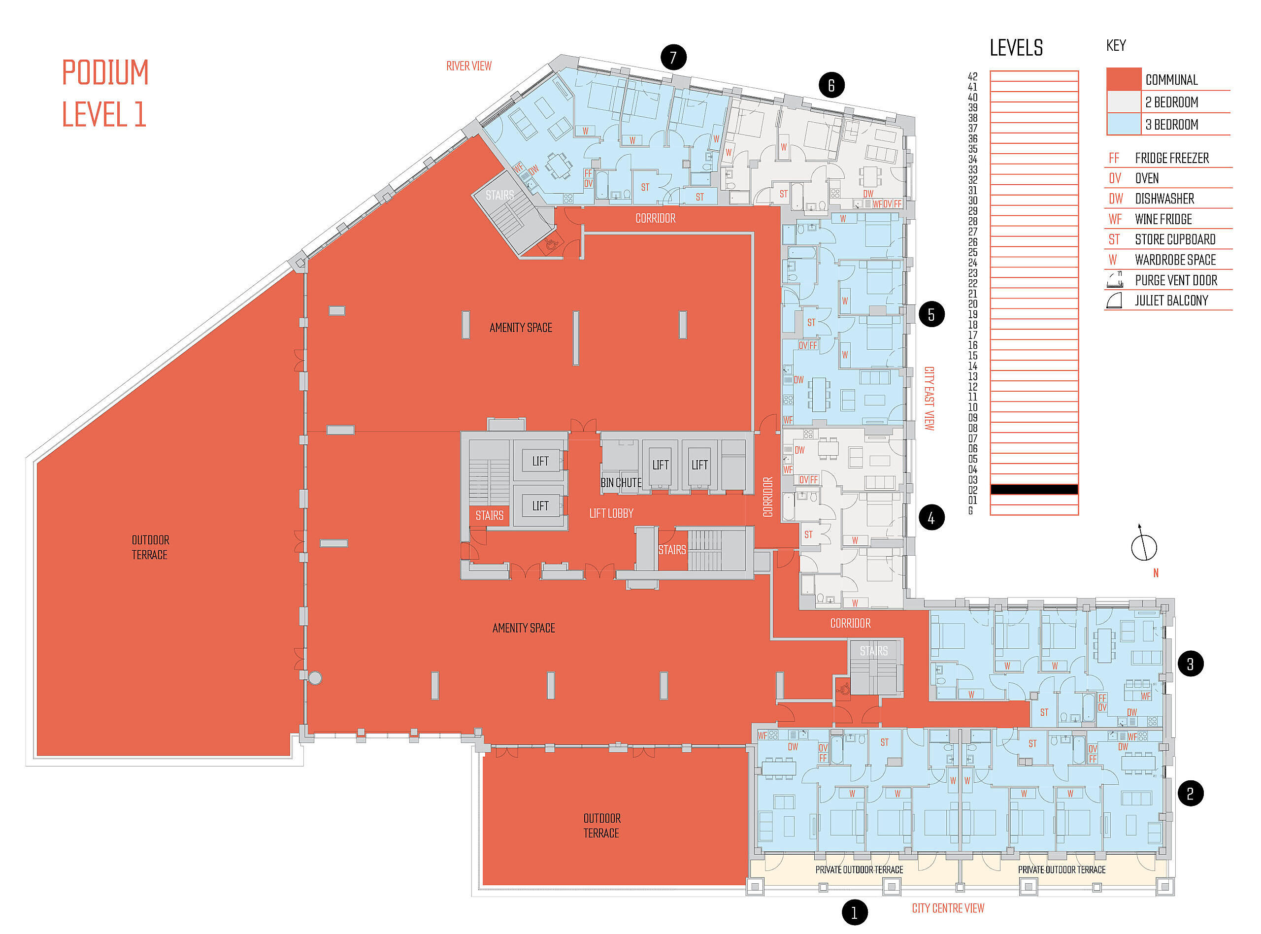 - 3 tower lifts provide access from ground level up to and including level 42.