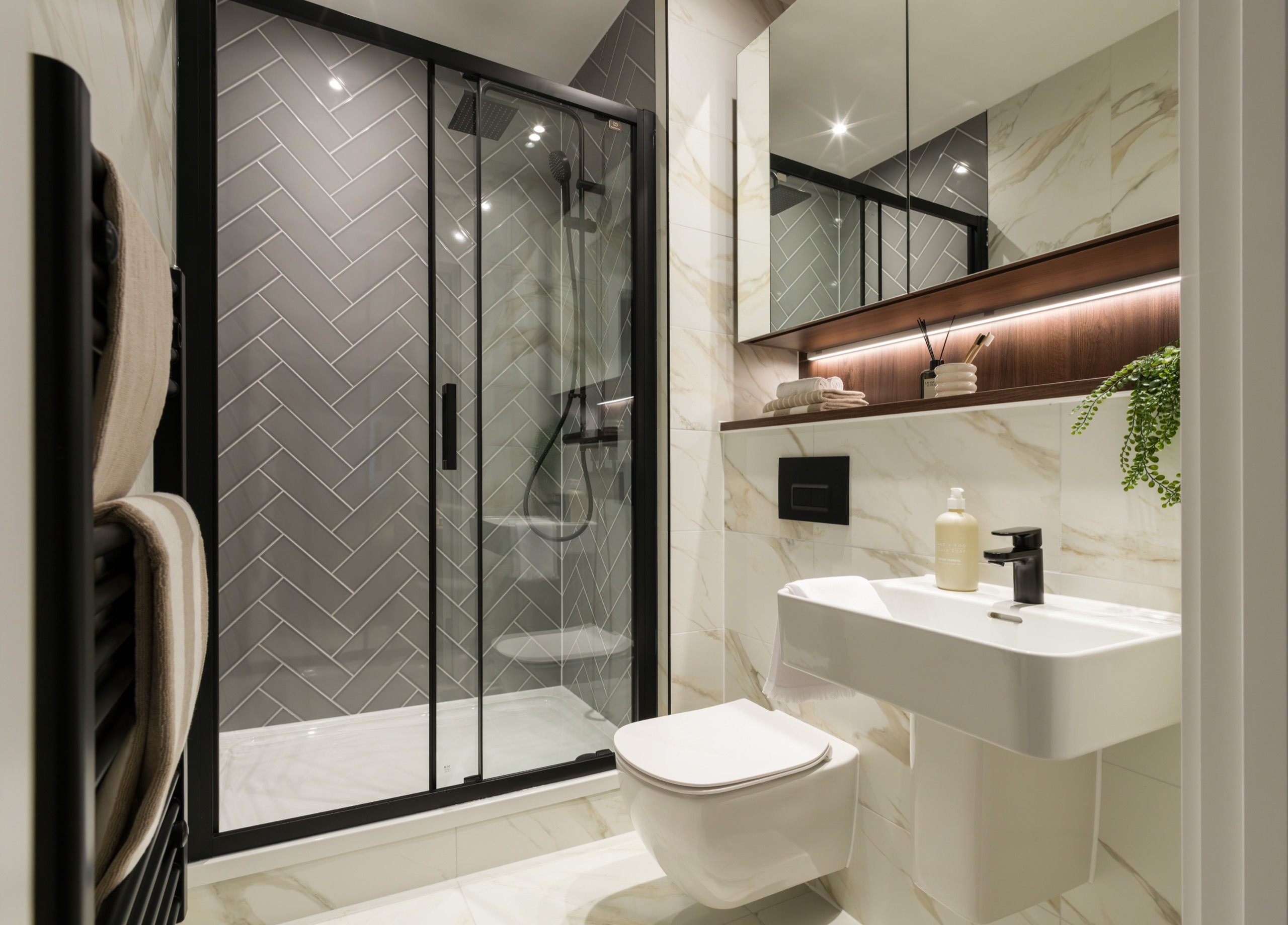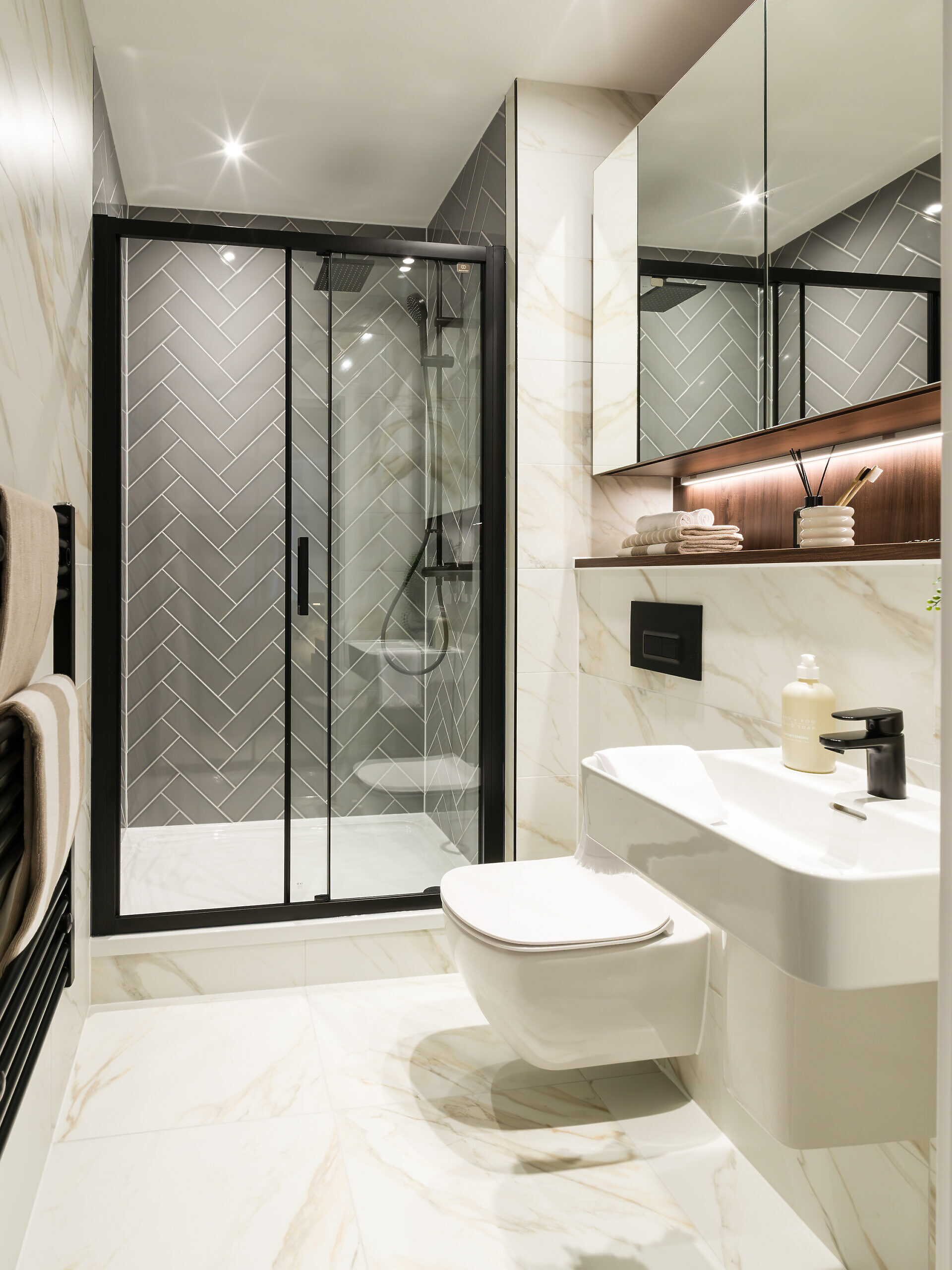 - Bespoke storage with mirrored doors and shelving, with built-in shaver socket and lighting