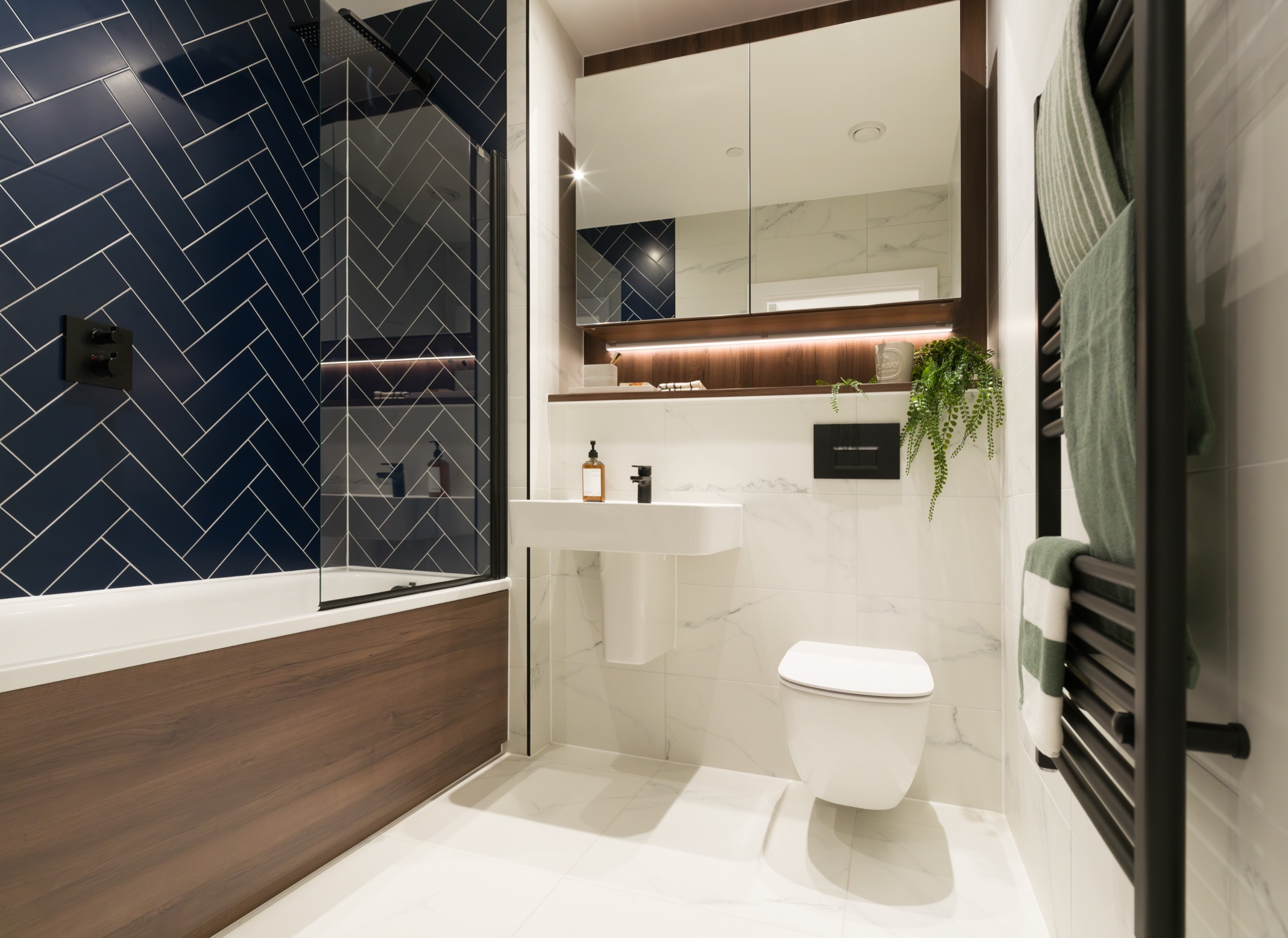 - Fully tiled bathroom with feature navy metro tile to bath area