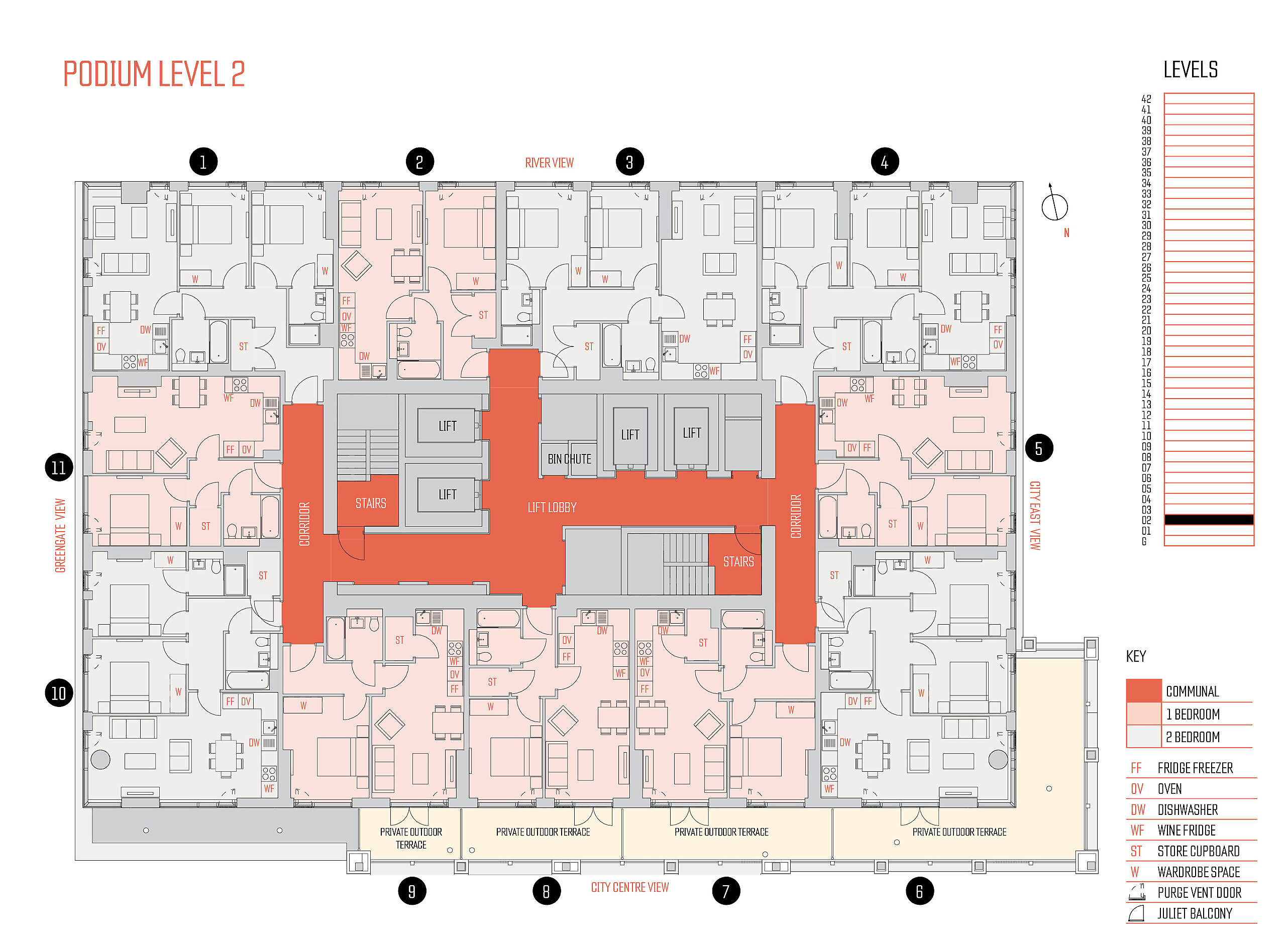 - 3 tower lifts provide access from ground level up to and including level 42.