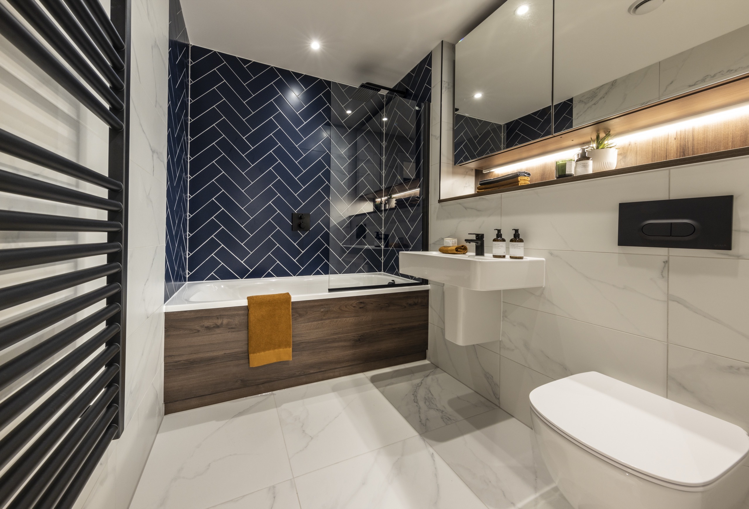 - Fully tiled bathroom with feature navy metro tile to bath area