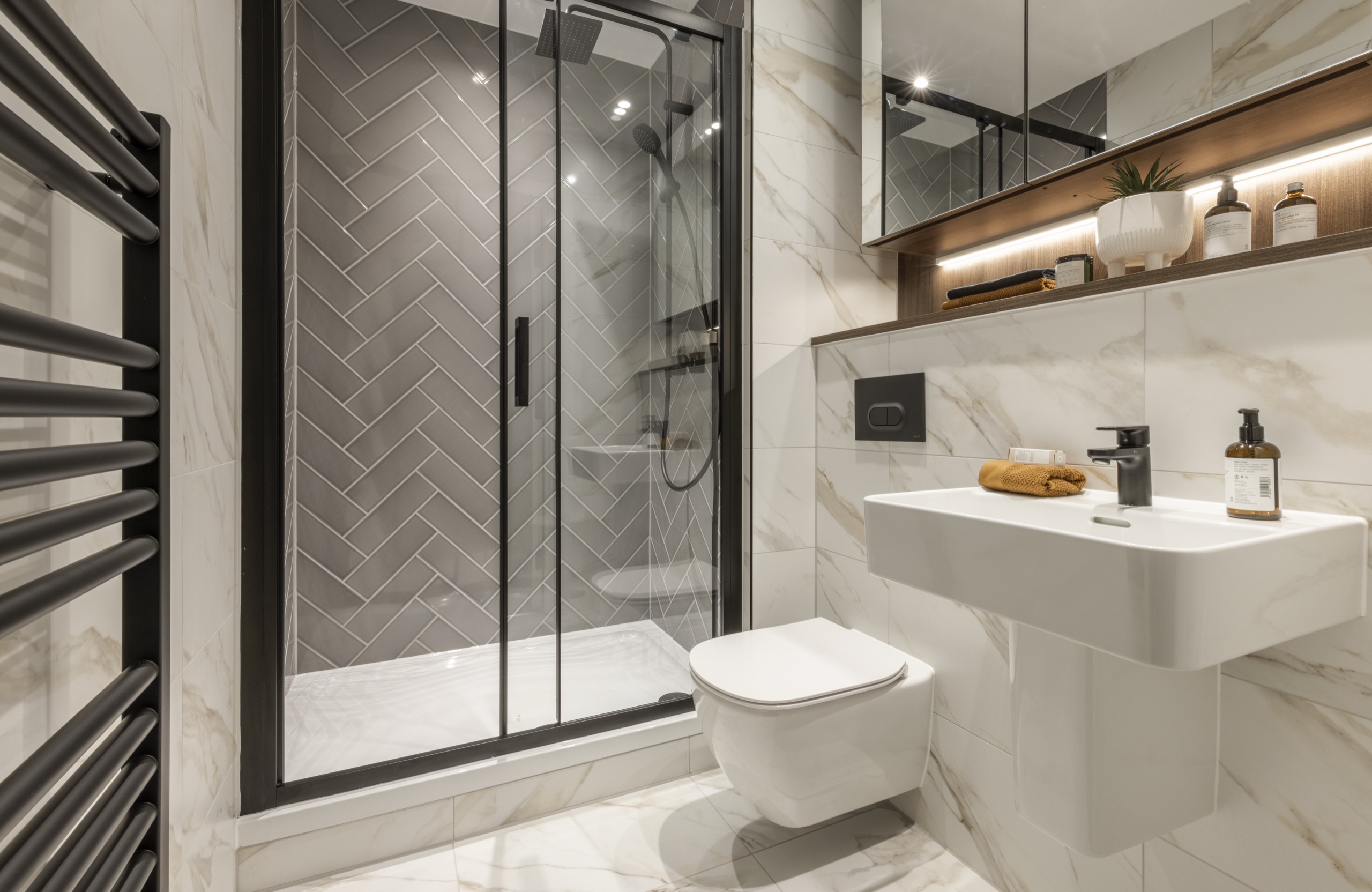 - Bespoke storage with mirrored doors and shelving, with built-in shaver socket and lighting