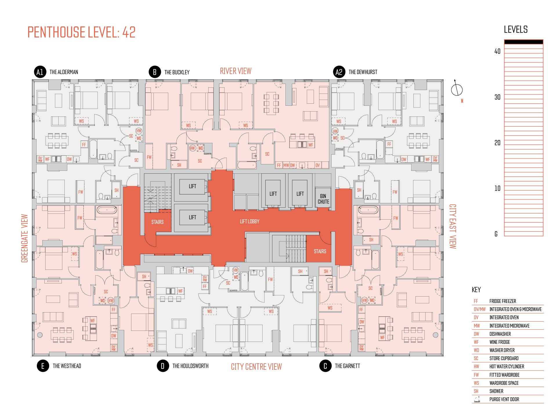 - 3 tower lifts provide access from ground level up to and including level 42.