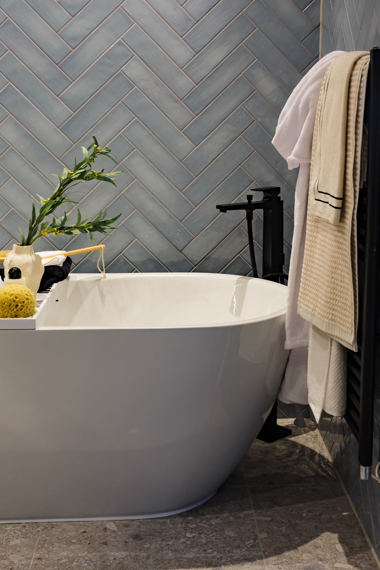 - Floor-to-ceiling fully tiled bathroom with feature tiling to bath area