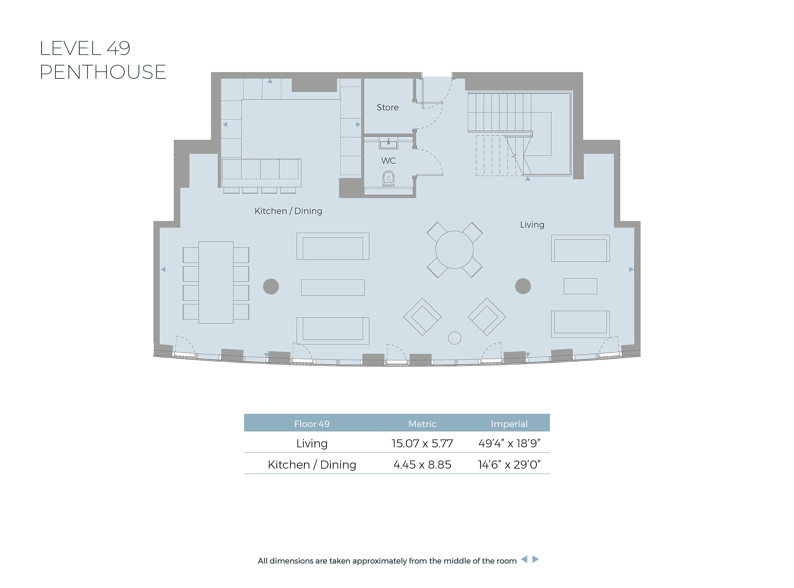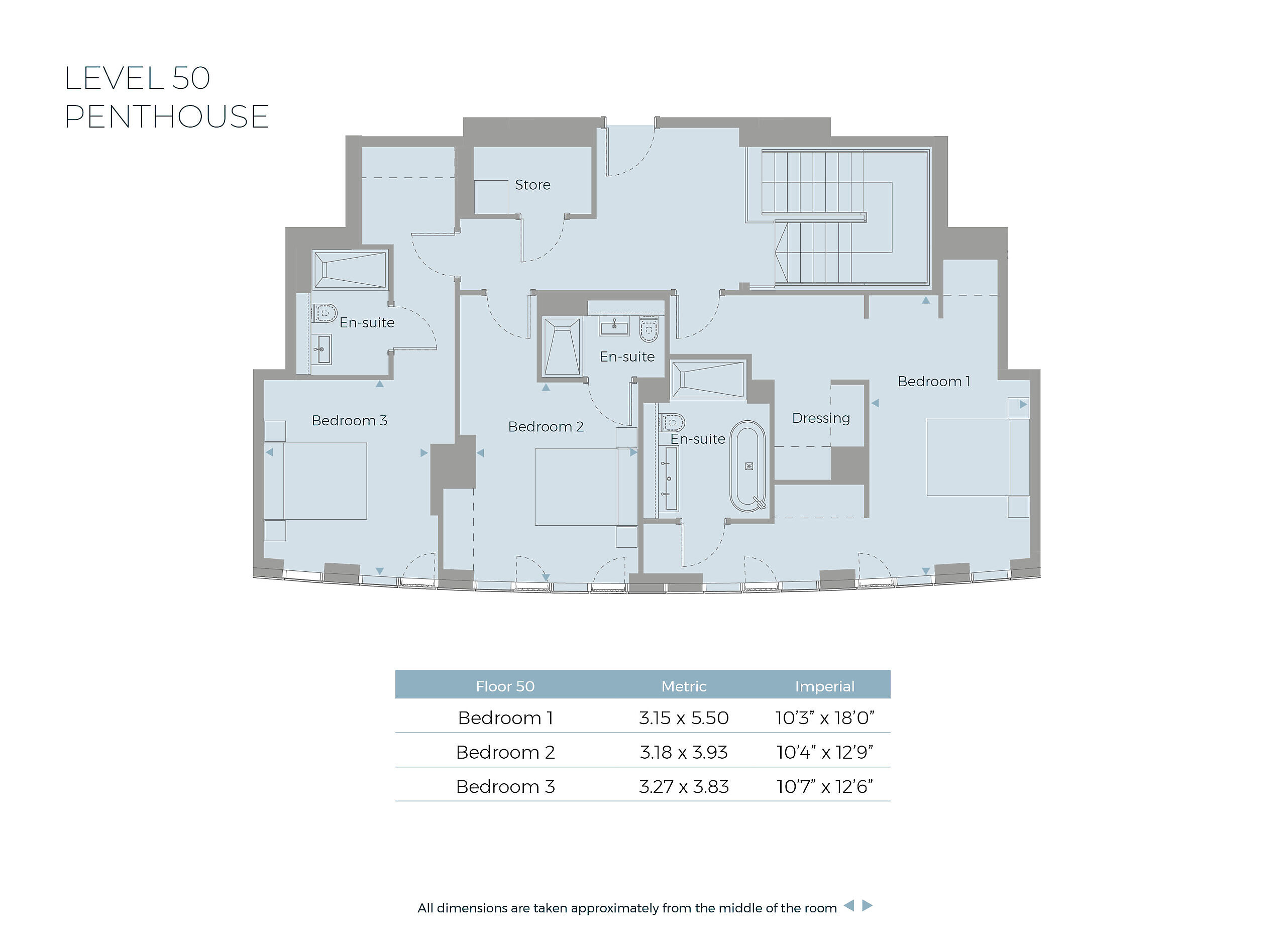 - 4 lifts provide access from the concierge on the ground floor to level 49, whilst a separate lift provides access to the car park and cycle stores on the basement levels.