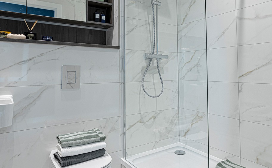 - Bespoke storage with mirrored doors and shelving, with built-in shaver socket and lighting