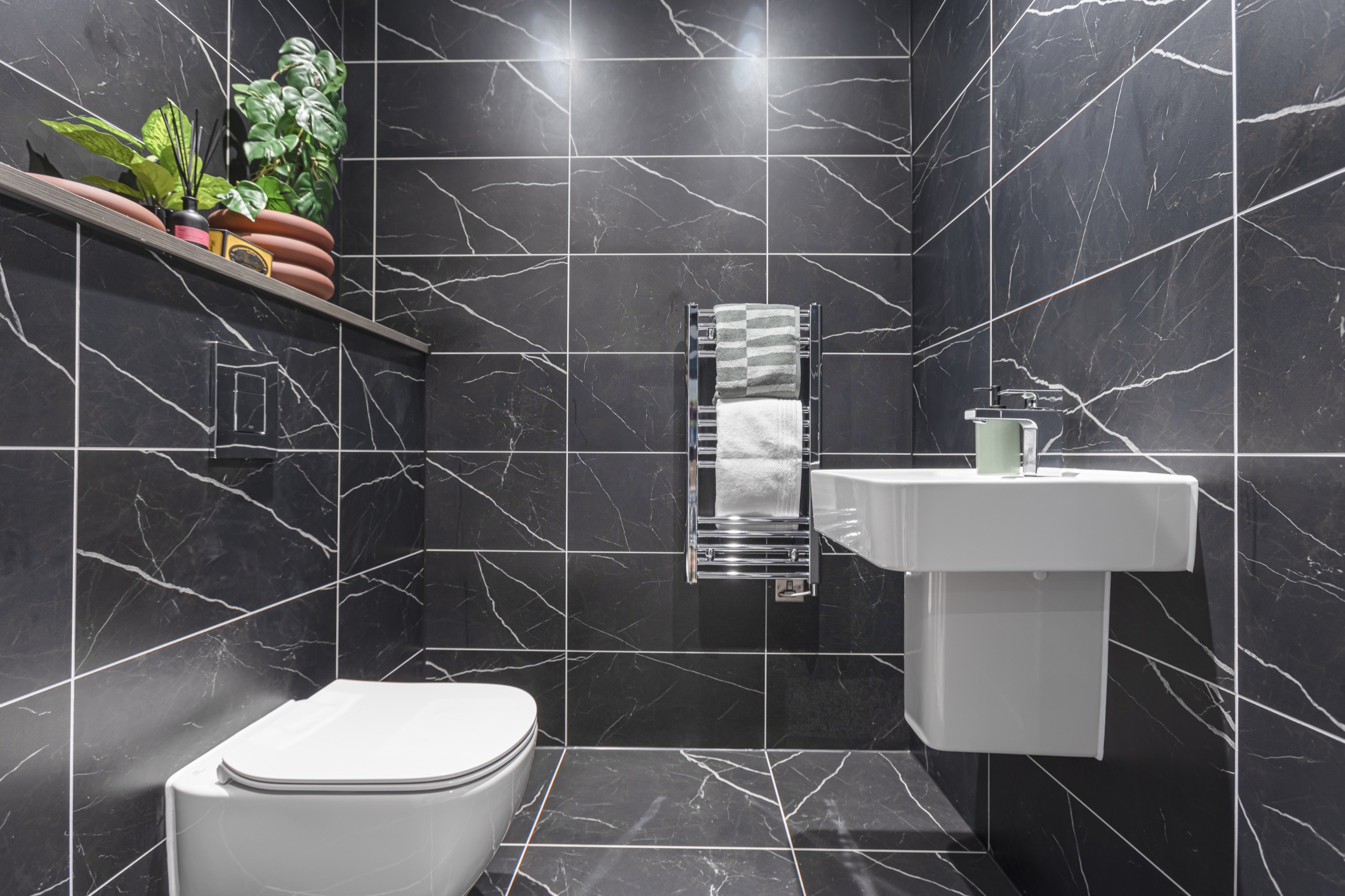 - Wall-mounted wash basin and W.C. with concealed cistern and soft close seat