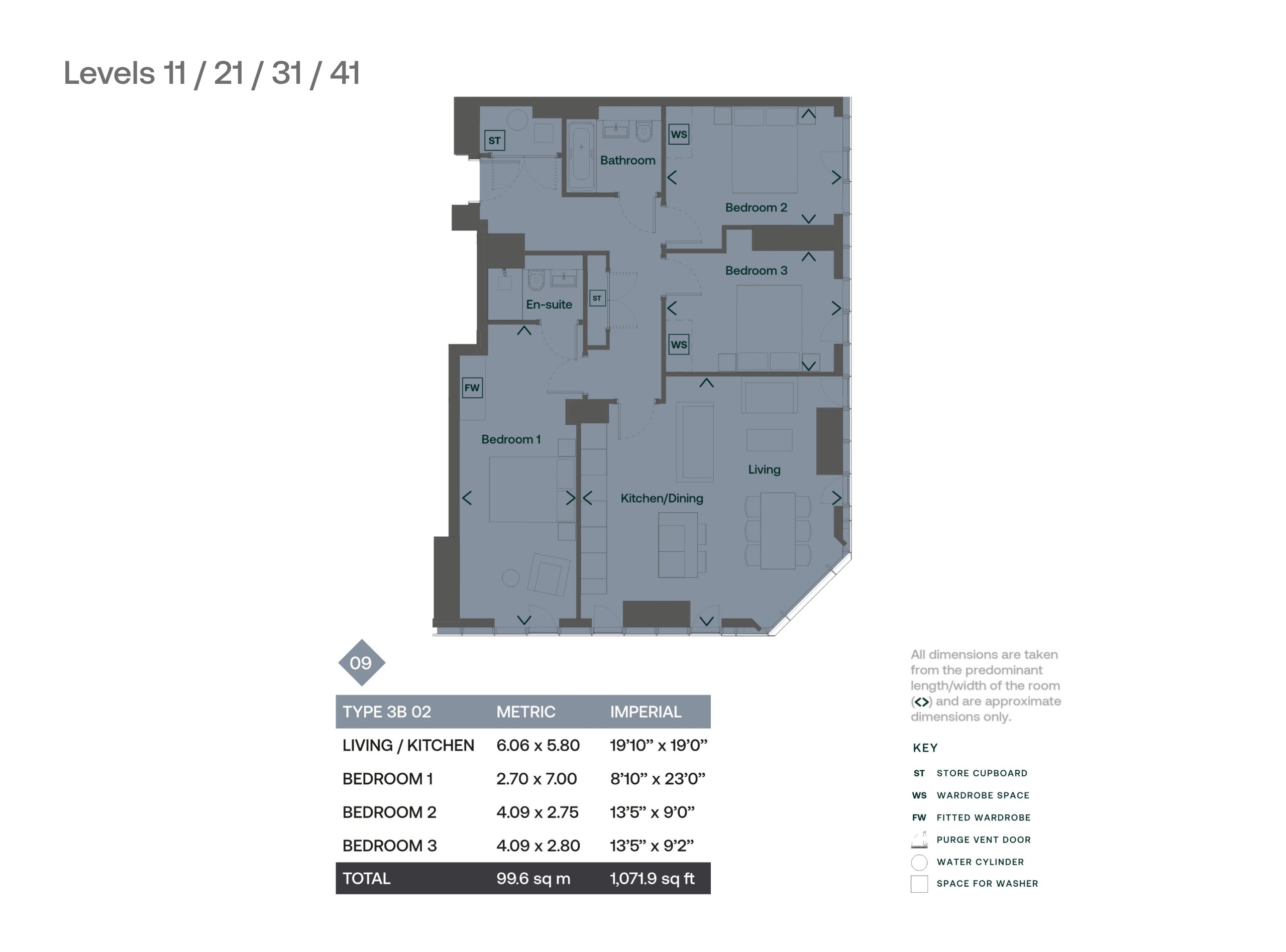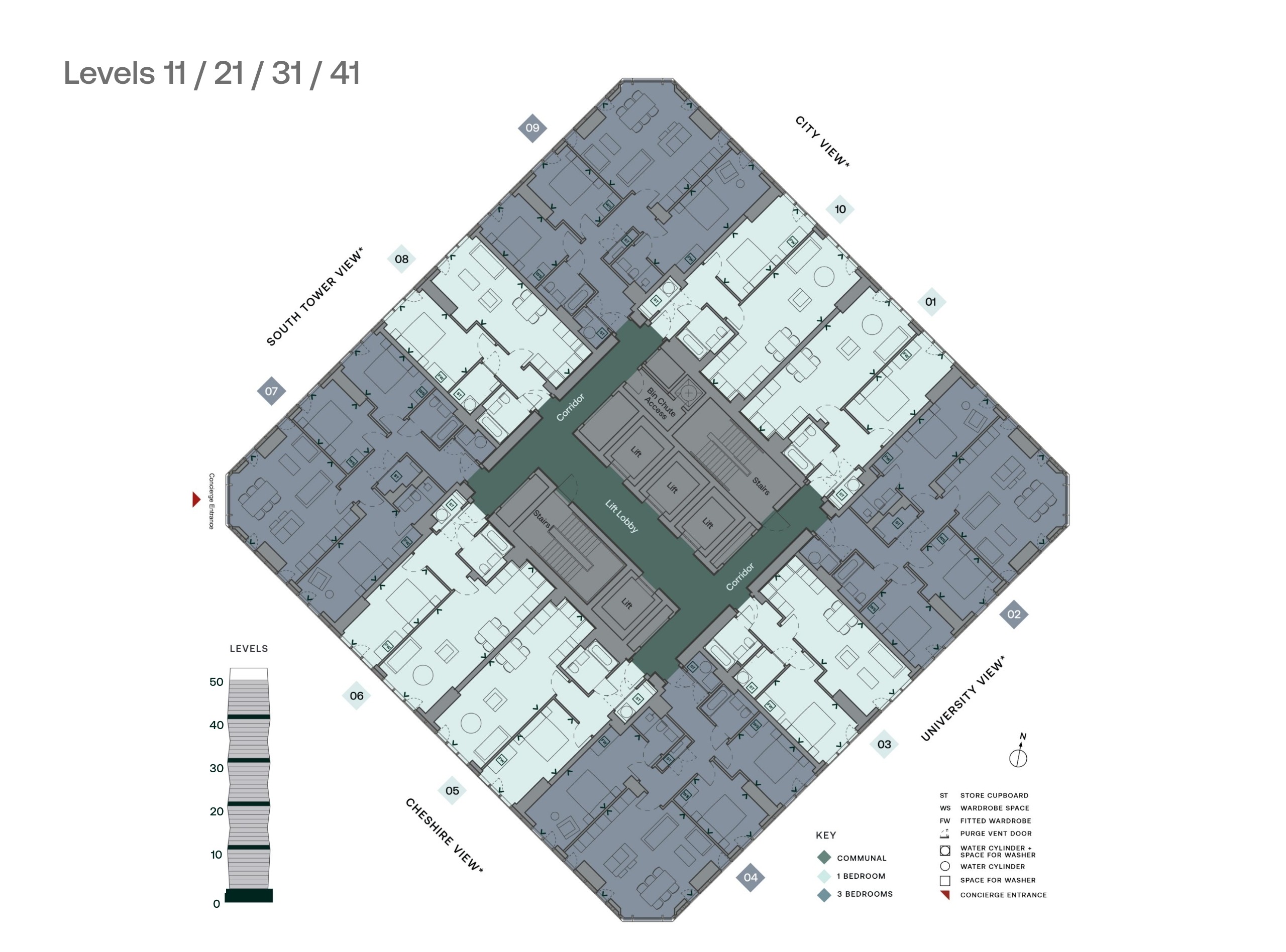 All dimensions are taken from the predominant length/width of the room (< >) and are approximate dimensions only. The apartment sizes detailed indicate the smallest sq m/sq ft for each apartment type. Layout sizes and measurements may vary within a 5% tolerance. Floorplates shown are approximate dimensions only. Please be advised the windows on the corners of the building from floors 2-40 are at an angle of circa 5.01° on each floor. From floors 41-50 the angle on each floor is 2.44°. As the building corners are chamfered in and out, this angle may be inward facing or outward facing. Please refer to Sales Consultant, CGIs, and models for further clarification. There are changes to the thickness/width of the column structure throughout the building. Notably, changes are observed at levels 2, 15, 31, and 40. This design modification leads to a slight increase in square footage on higher levels. Purge vent door panel positions will vary on all elevations. Kitchen layouts are indicative only and may be subject to change. Please refer to the specific apartment floorplans to understand each apartment’s layout. These dimensions are not intended for carpet, flooring, appliance, or furniture measurements. Specification and finishes are subject to change in the event that materials or appliances become discontinued or are unavailable. Specific apartment views are available as drone photography. Please speak to a member of the sales team for further information. *All view descriptions are generic, please speak to Sales Consultant for exact view details.