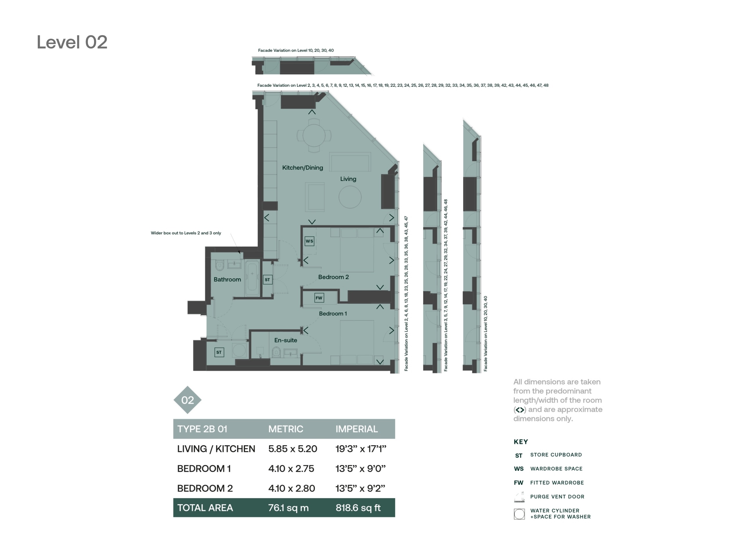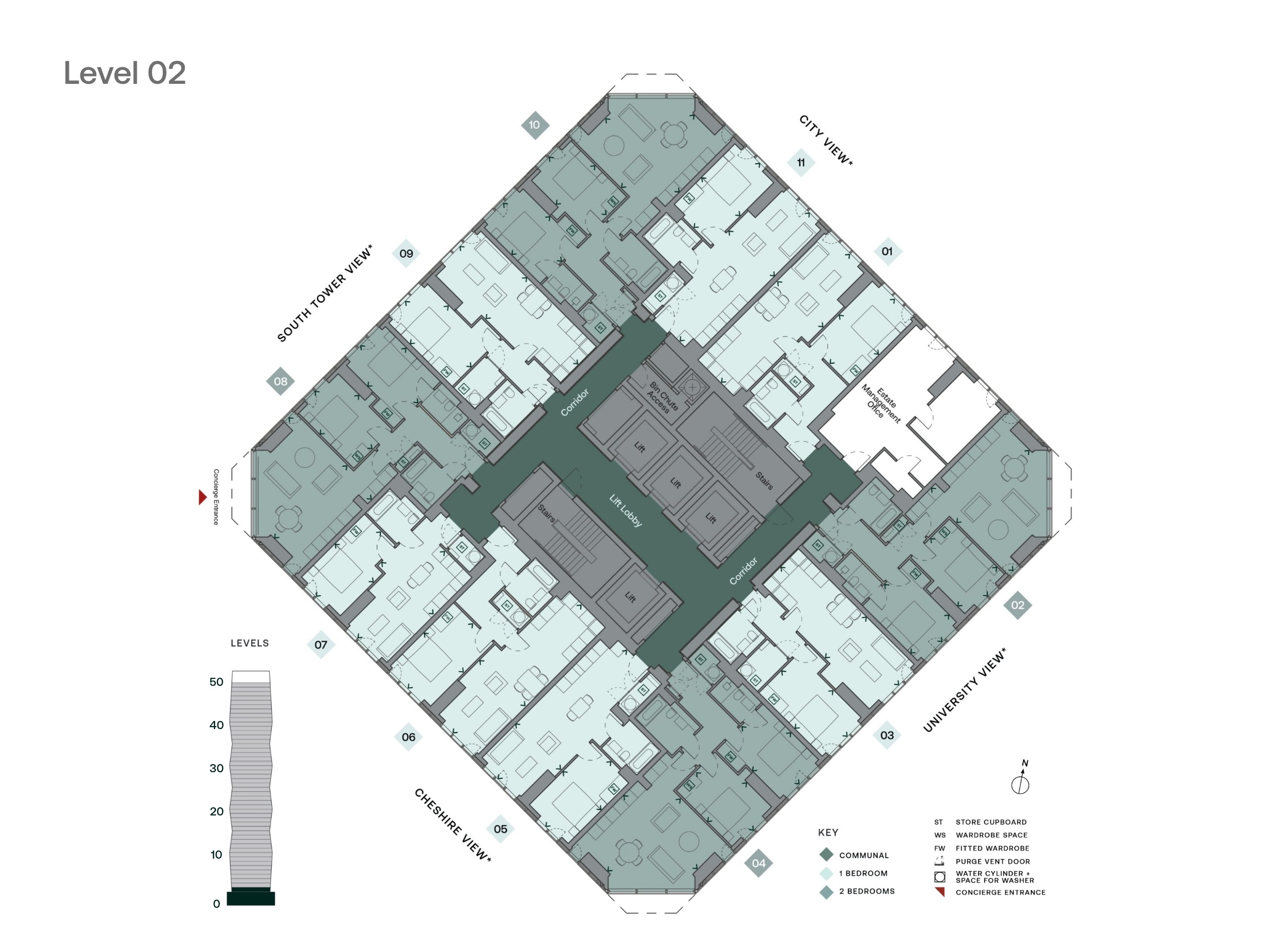 All dimensions are taken from the predominant length/width of the room (< >) and are approximate dimensions only. The apartment sizes detailed indicate the smallest sq m/sq ft for each apartment type. Layout sizes and measurements may vary within a 5% tolerance. Floorplates shown are approximate dimensions only. Please be advised the windows on the corners of the building from floors 2-40 are at an angle of circa 5.01° on each floor. From floors 41-50 the angle on each floor is 2.44°. As the building corners are chamfered in and out, this angle may be inward facing or outward facing. Please refer to Sales Consultant, CGIs, and models for further clarification. There are changes to the thickness/width of the column structure throughout the building. Notably, changes are observed at levels 2, 15, 31, and 40. This design modification leads to a slight increase in square footage on higher levels. Purge vent door panel positions will vary on all elevations. Kitchen layouts are indicative only and may be subject to change. Please refer to the specific apartment floorplans to understand each apartment’s layout. These dimensions are not intended for carpet, flooring, appliance, or furniture measurements. Specification and finishes are subject to change in the event that materials or appliances become discontinued or are unavailable. Specific apartment views are available as drone photography. Please speak to a member of the sales team for further information. *All view descriptions are generic, please speak to a Sales Consultant for exact view details.