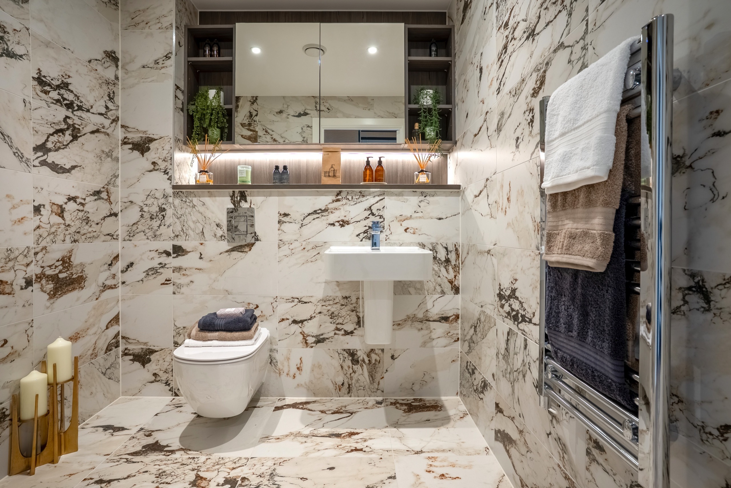 • Wall-mounted wash basin and WC with concealed cistern and soft close seat
