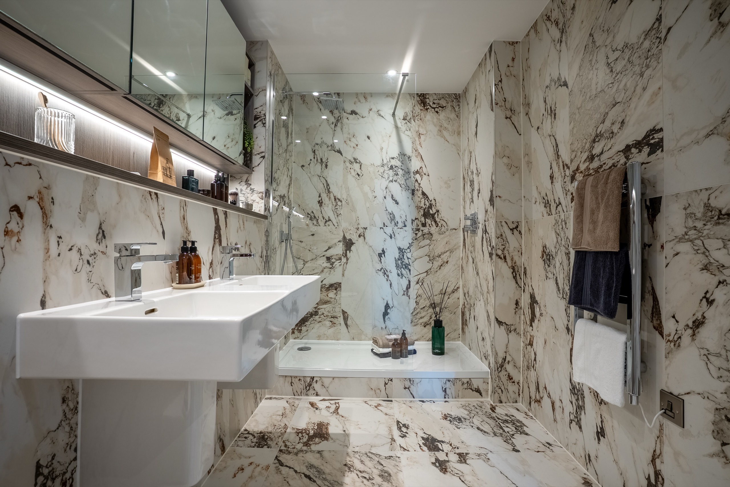 • Bespoke storage with mirrored doors and shelving, with built-in shaver socket and lighting
