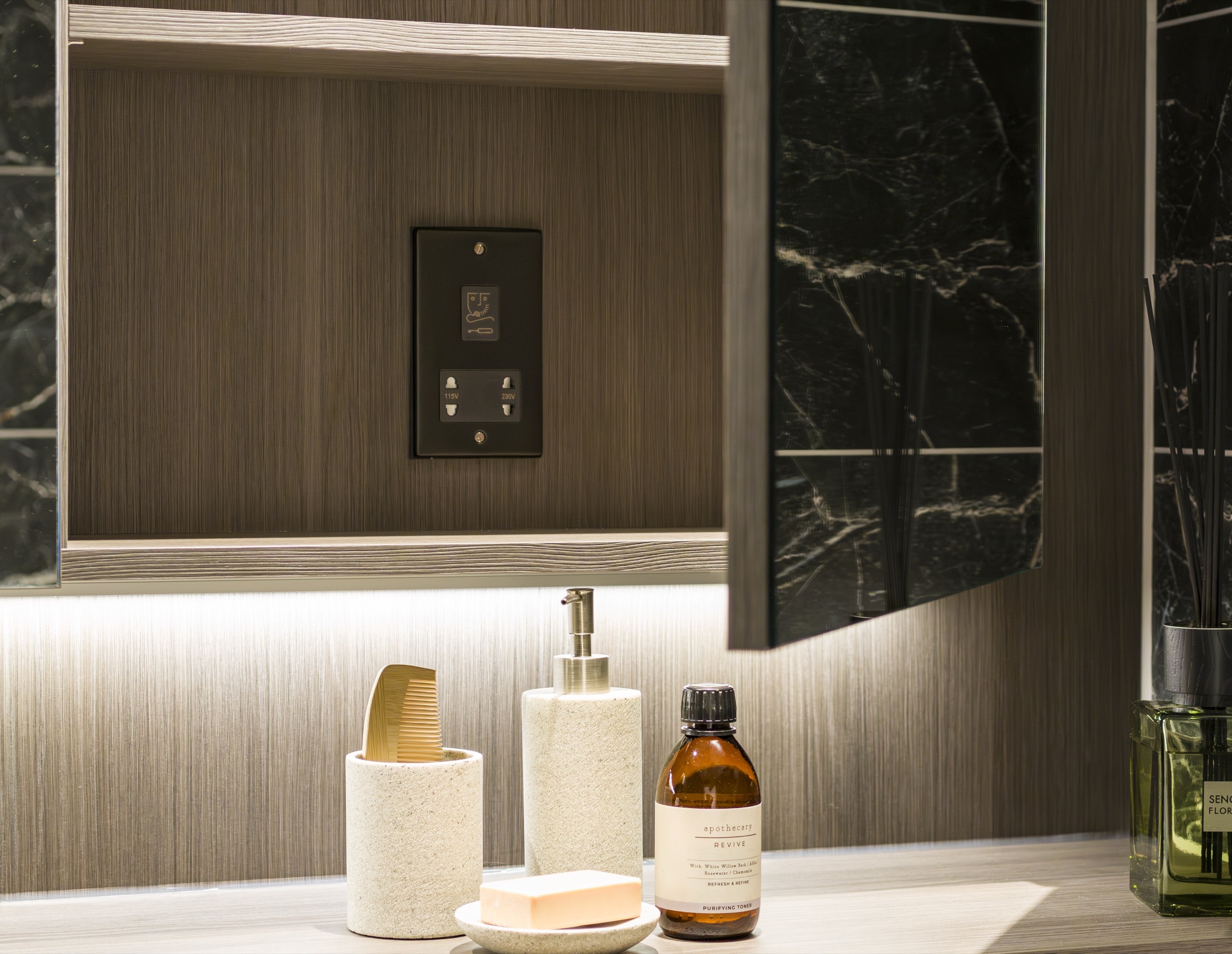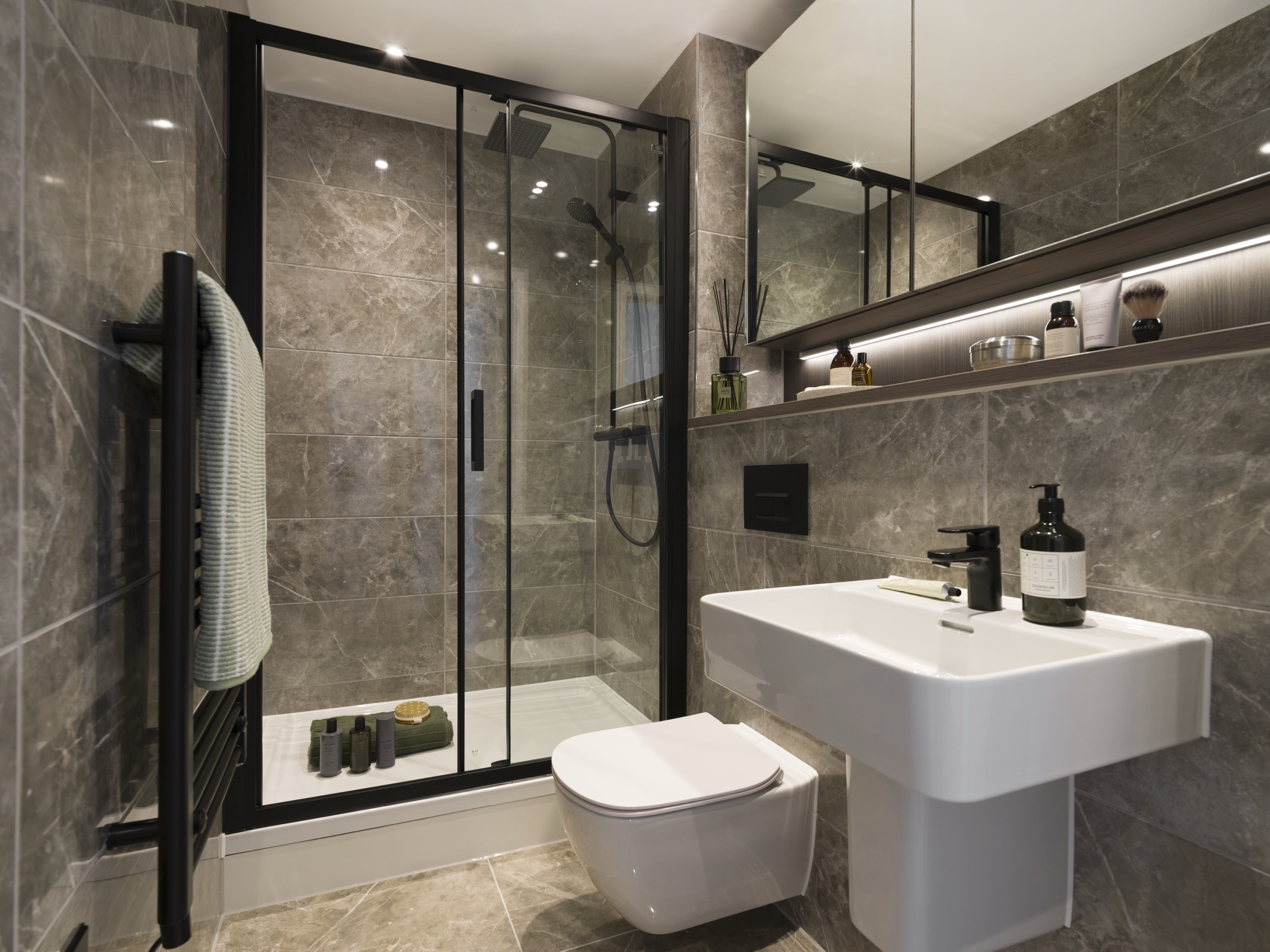 - Bespoke storage with mirrored doors and shelving, with built-in shaver socket and lighting