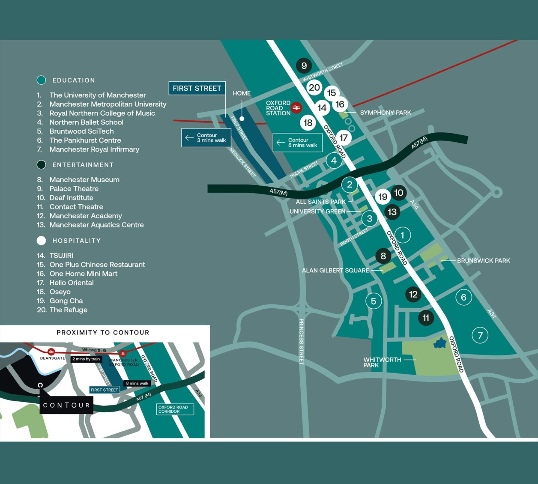 Just an 8-minute walk from Contour, the Oxford Road Corridor – also known as the Knowledge Quarter – is home to world-class universities, colleges, and research institutions. With its strong focus on education and innovation, it offers a hub of academic excellence, cultural richness, and a vibrant student experience.