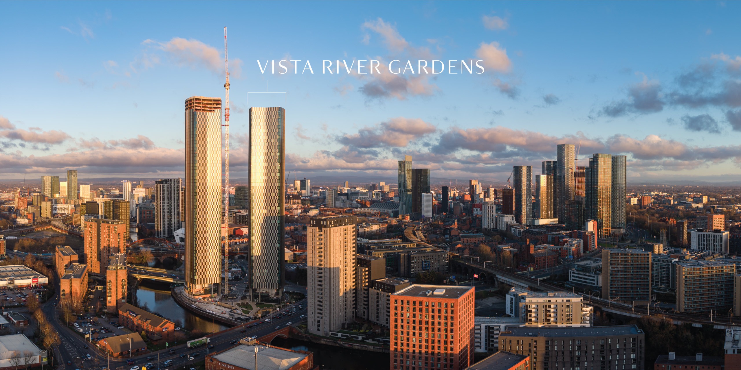 Vista River Gardens introduces a new chapter of riverside living, with distinctive architecture shaped by the curves of the River Irwell. Two elegant towers sit within a richly landscaped setting, offering secure underground parking, private terraces, and interlinked amenity spaces.