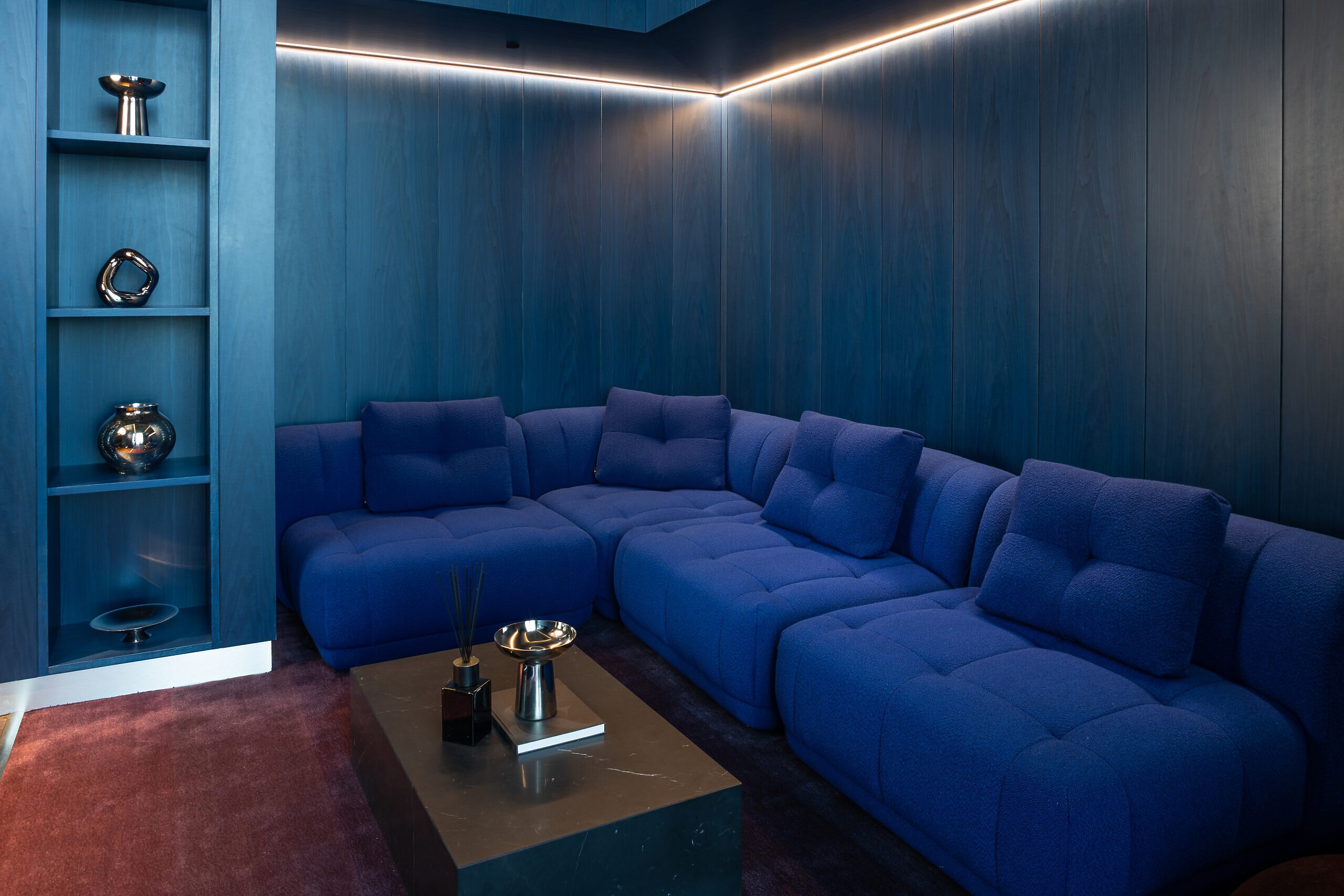 A colour palette of deep blues, rich purples, and vibrant yellows – drawn from Victorian dyes – is layered with dark timber, brushed metal, velvet, and stone.
